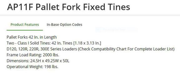 AP11F Pallet Fork Fixed Tines for D120, 120R, 220R, 300E Series Loaders