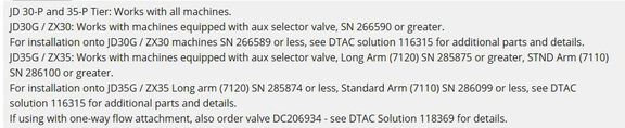 Hyd clamp attachment for 30G or 35G mini excavator. New in crate. JD 30-P and 35-P Tier: Works with all machines. JD30G / ZX30: Works with machines equipped with aux selector valve, SN 266590 or greater. For installation onto JD30G / ZX30 machines SN 266589 or less, see DTAC solution 116315 for additional parts and details. JD35G / ZX35: Works with machines equipped with aux selector valve, Long Arm (7120) SN 285875 or greater, STND Arm (7110) SN 286100 or greater. For installation onto JD35G / ZX35 Long arm (7120) SN 285874 or less, Standard Arm (7110) SN 286099 or less, see DTAC solution 116315 for additional parts and details. If using with one-way flow attachment, also order valve DC206934 - see DTAC Solution 118369 for details. If For Paladin Customworks Install, order AT349584 Installation Fee.