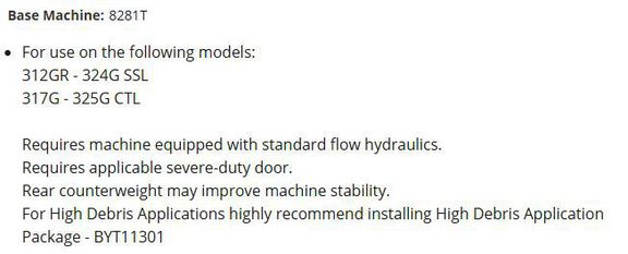 For use on the following models: 312GR - 324G SSL 317G - 325G CTL Requires machine equipped with standard flow hydraulics. Requires applicable severe-duty door. Rear counterweight may improve machine stability. For High Debris Applications highly recommend installing High Debris Application Package - BYT11301