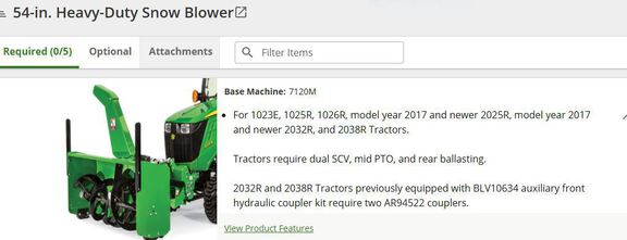 For 1023E, 1025R, 1026R, model year 2017 and newer 2025R, model year 2017 and newer 2032R, and 2038R Tractors. LESS SNOWBLOWER MOUNTING KIT | LESS 2000 RPM FRONT PTO | LESS FRNT HITCH/HYDRAULIC LF